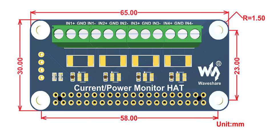 This is a 4-ch current and power monitor HAT designed for Raspberry Pi. Via the I2C or SMBus interface, it is easy to monitor each channel's current, voltage, and power consumption, as well as the voltage between both sides of the sampling resistor.