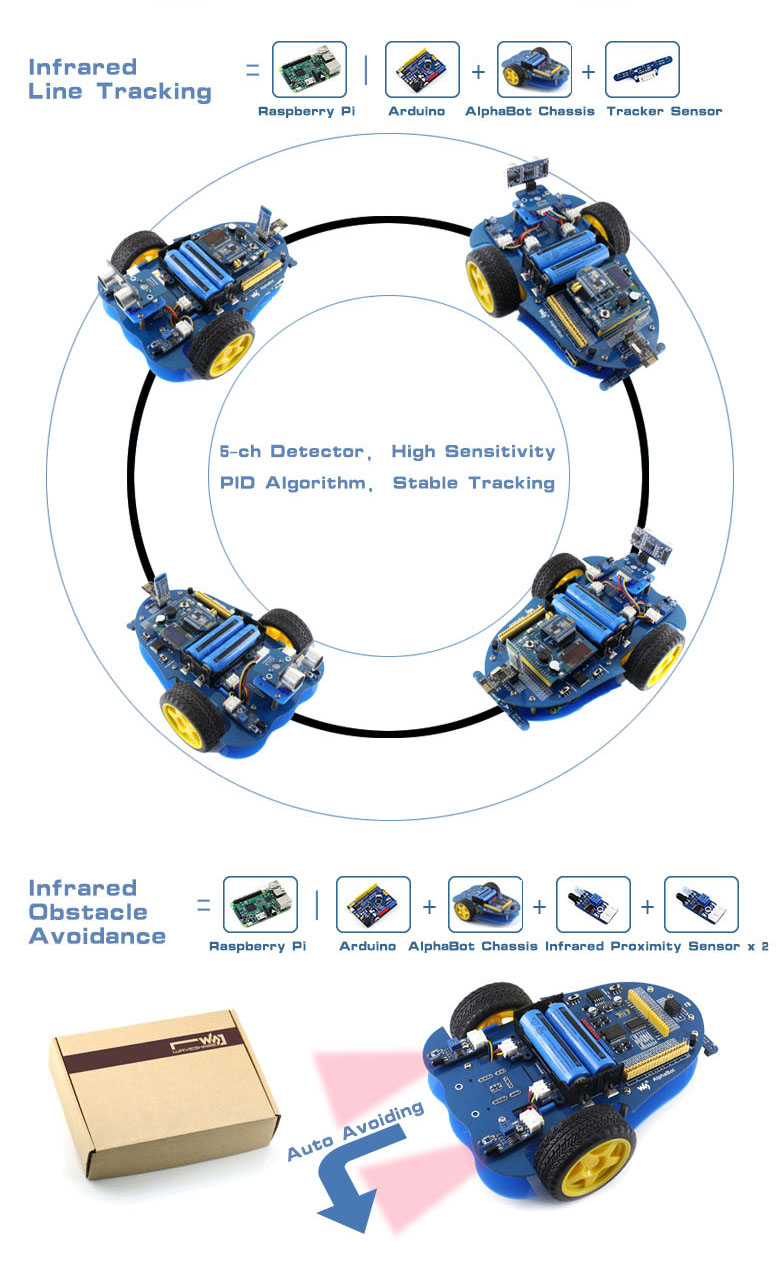 AlphaBot is a robotic development platform compatible with Raspberry Pi and Arduino. It consists of the AlphaBot mainboard, the mobile chassis, and everything required to get it moving.