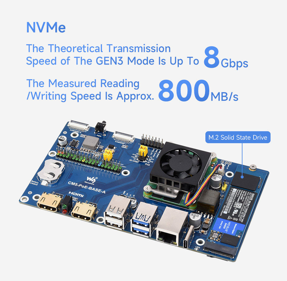 Faster reading/writing speed compared to the TF card slot of Raspberry Pi, greatly improving reading/writing efficiency of the system or files, support booting Raspberry Pi from NVMe Solid State Drive