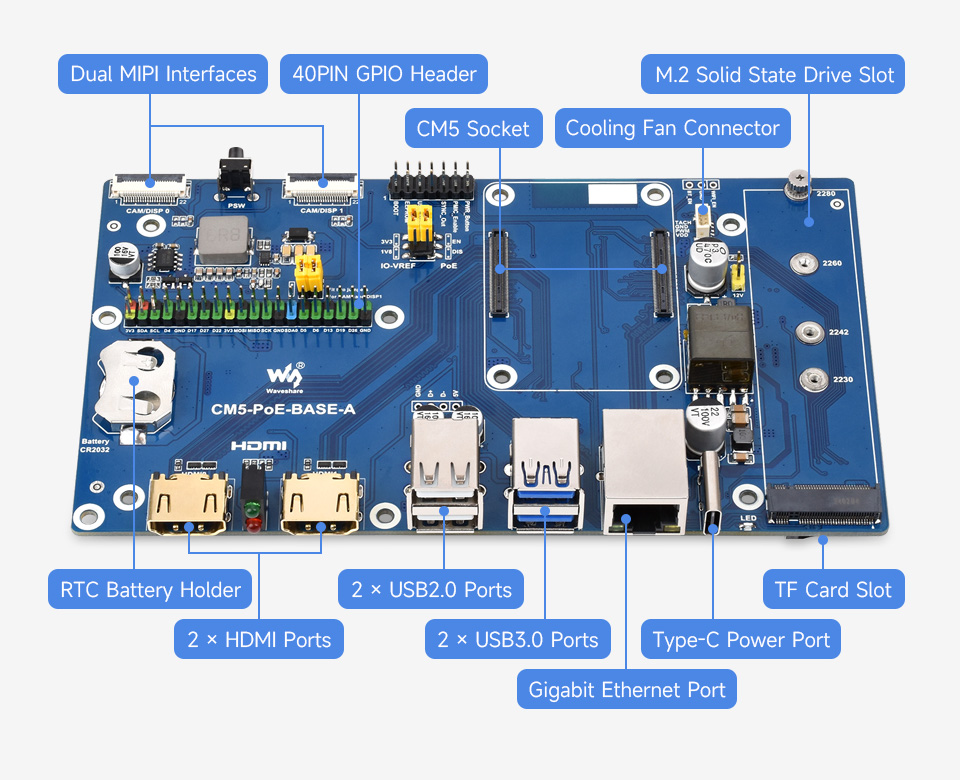 Onboard connectors including MIPI / M.2 / HDMI / USB / ETH / TF Card Slot