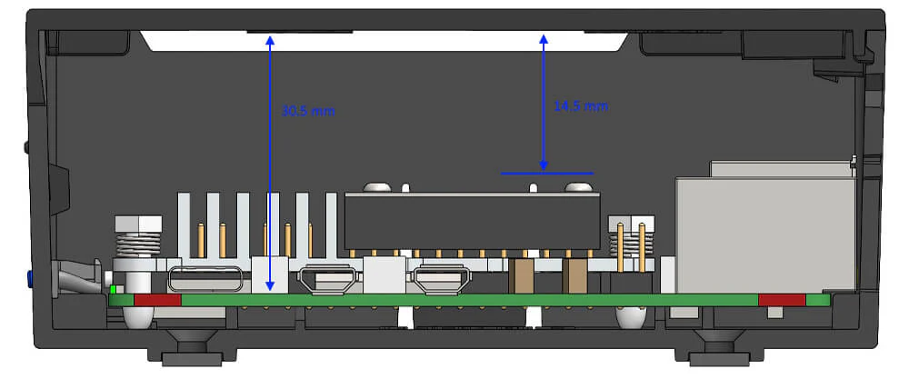 If not using the Active Cooler, then the case can accommodate oversized heatsinks or cooling solutions, or any HAT up to 30.5mm above the Pi PCB that does not require input/output ports.