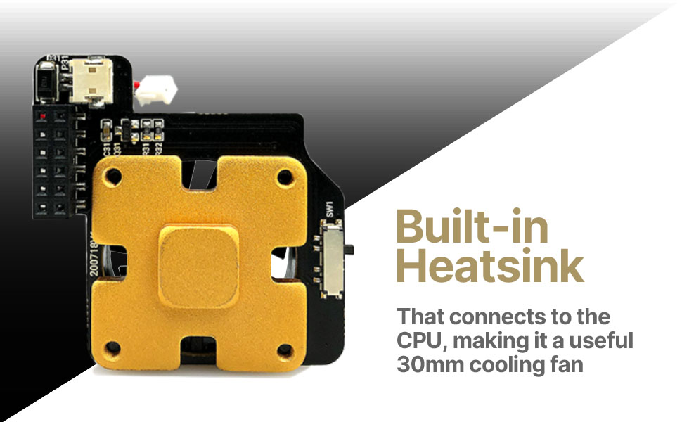 Has a built-in heatsink that connects to the CPU to make it a useful 30mm cooling fan