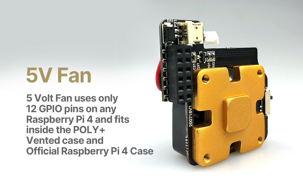5 volt fan uses only 12 GPIO pins on any Raspberry Pi 4 and fits inside the POLY+ Vented case and Official Raspberry Pi 4 Case