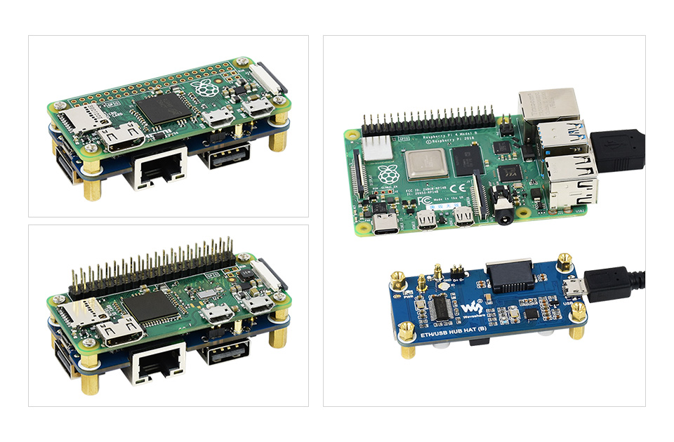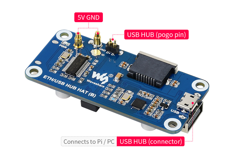 The ETH/USB HUB HAT (B) is an Ethernet and USB HUB designed for Raspberry Pi, providing 1x RJ45 Ethernet port and 3x USB 2.0 ports. It's pogo pin design is specialized for Zero series, while the onboard normal USB connector can be used to connect with other Raspberry Pi boards through a USB cable.