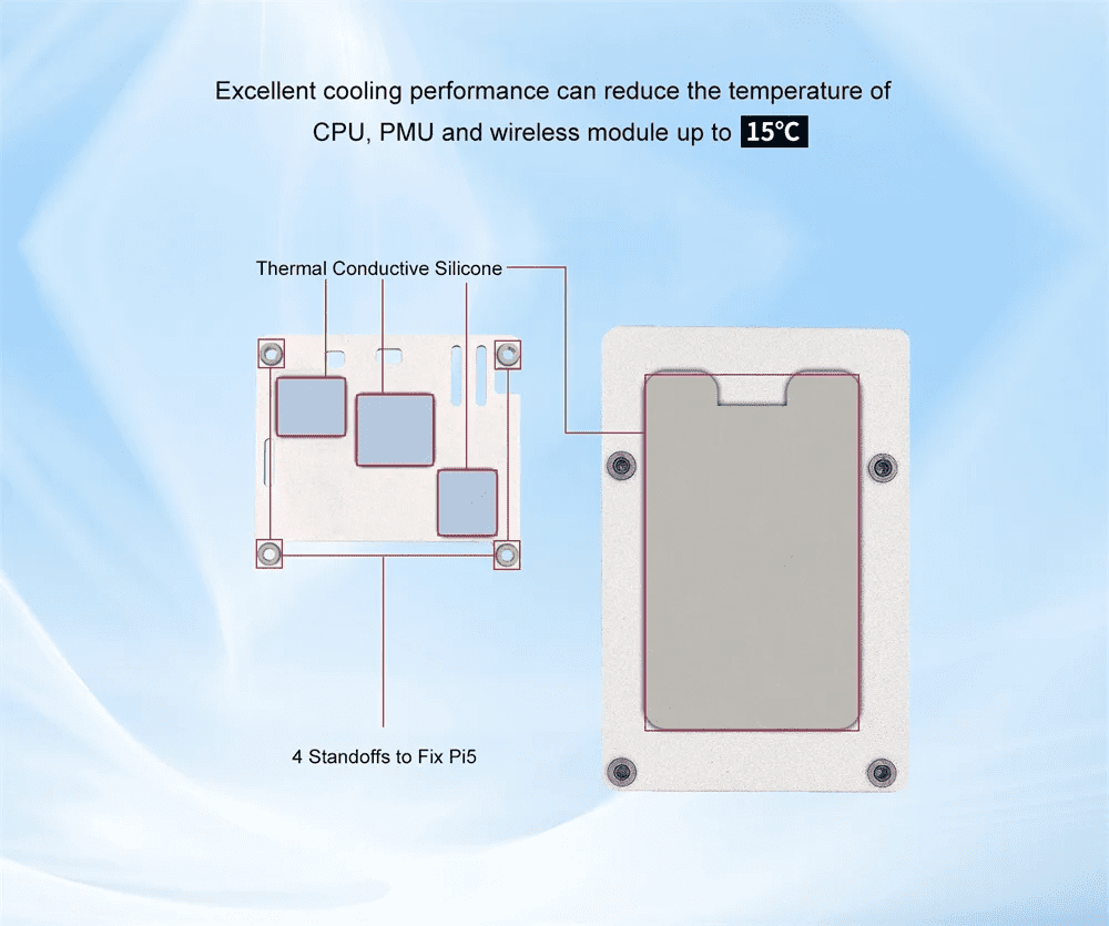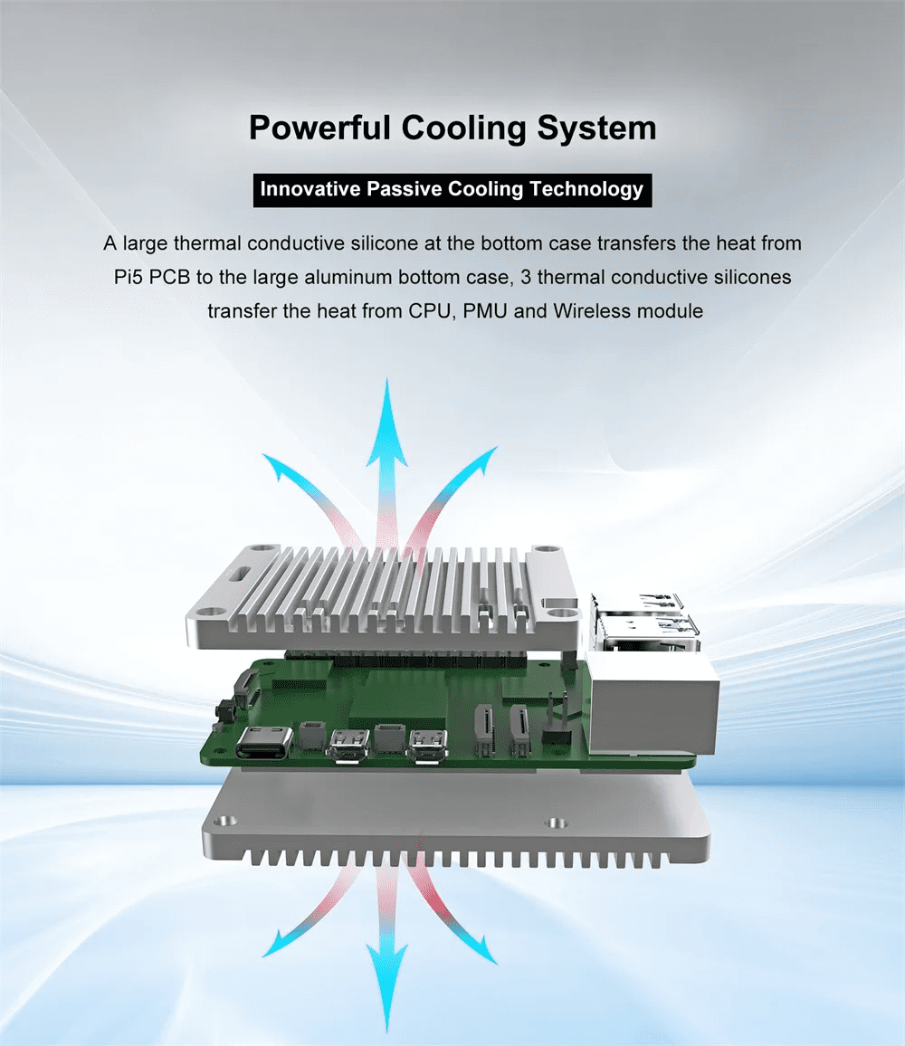 - Improved Passive Cooling with the addition of heatsink on the power management chip of the Raspberry Pi 5 aside from its CPU, which both get hot during heavy use.