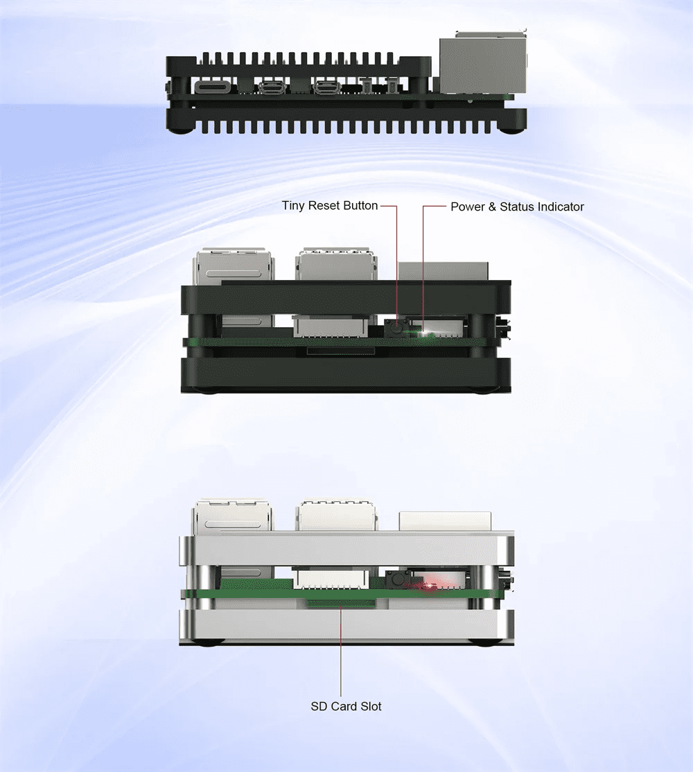 - Power button located at the back can perform the following with the installation of a open sourced script allows for safe shutdown, reboot and forced shutdown