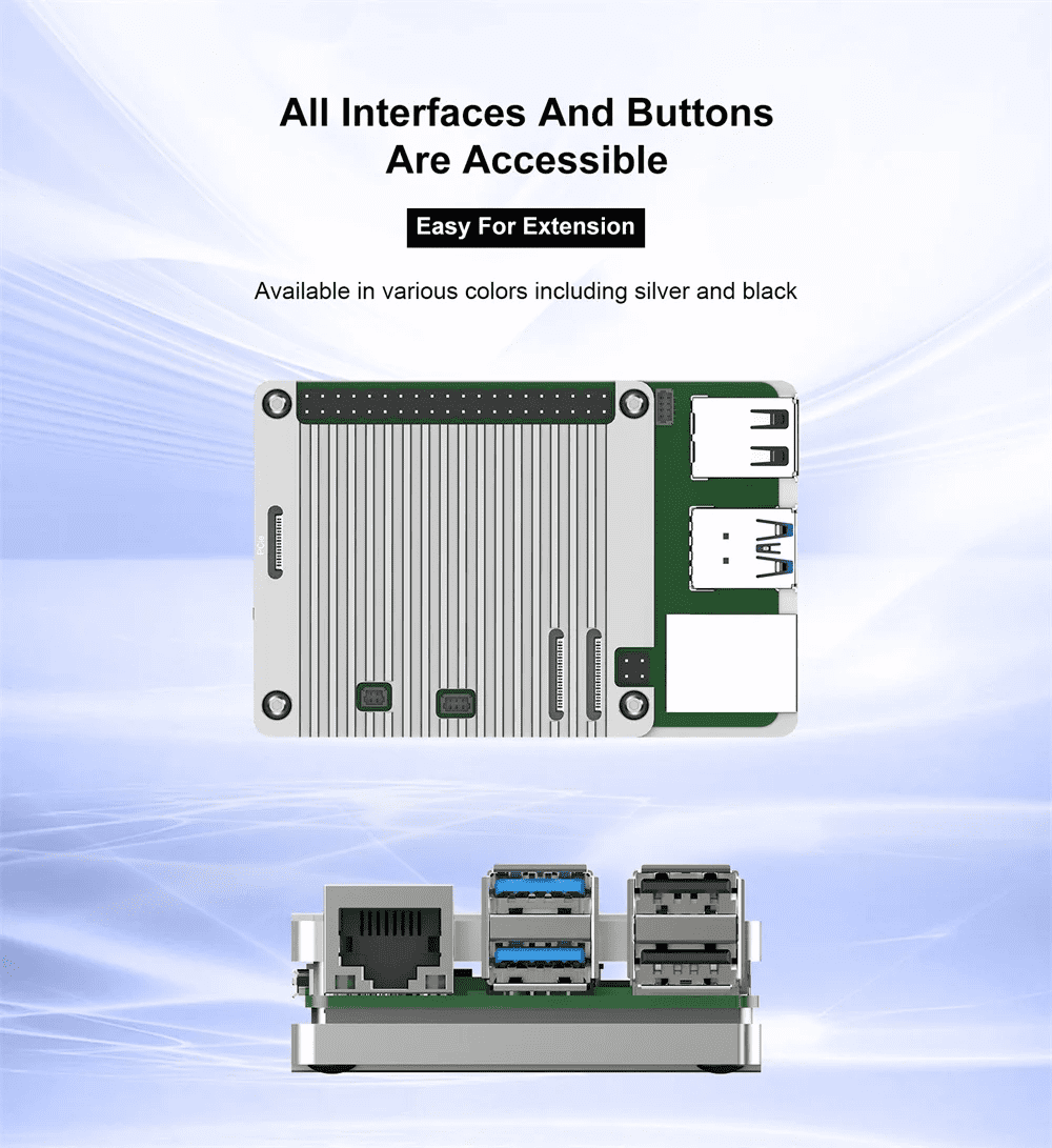 - Sleek magnetic cover to the access port of the custom color coded GPIO Pins.