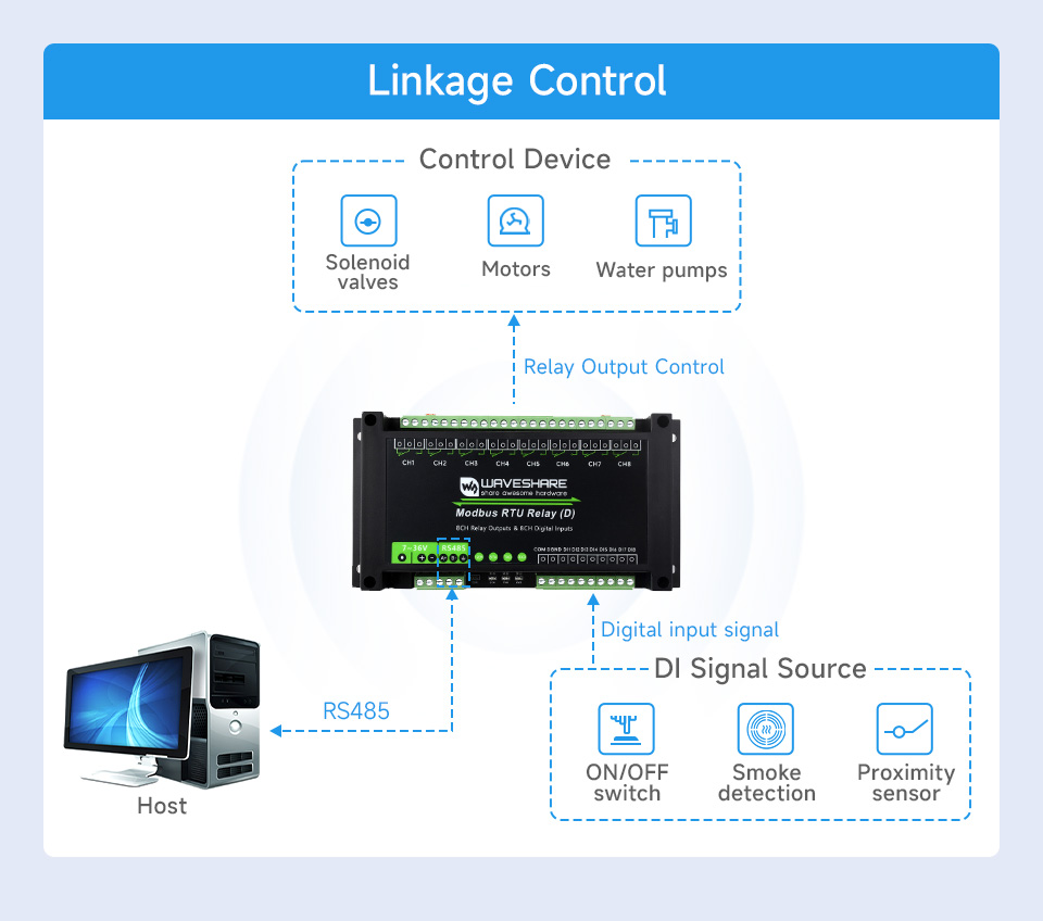 Supports Reading Digital Input By Sending Modbus RTU Protocol Commands Via RS485 For Relay Output Control