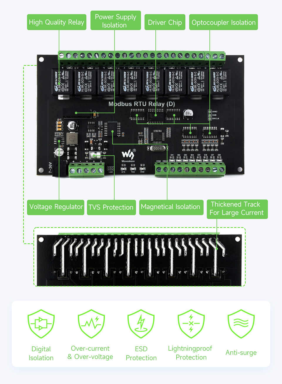 Industrial Modbus RTU 8-ch Relay Module (D) With Digital Input and RS485 Interface, Multi Isolation Protection Circuits, 7~36V Power Supply