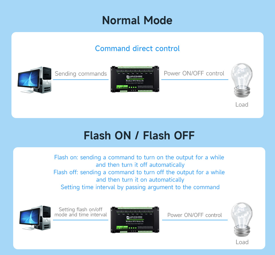 - Features flash-on, flash-off function, by passing argument to the command, it is possible to turn on the relay for a while and then close it automatically