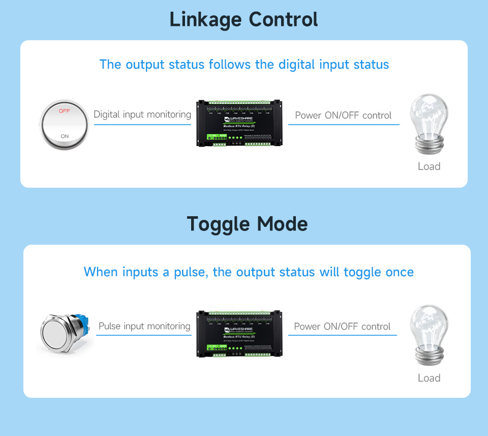 - Supports passive and active digital input, with bi-directional optocoupler isolation, built in debouncing algorithm. The relay supports digital input linkage control or toggle control