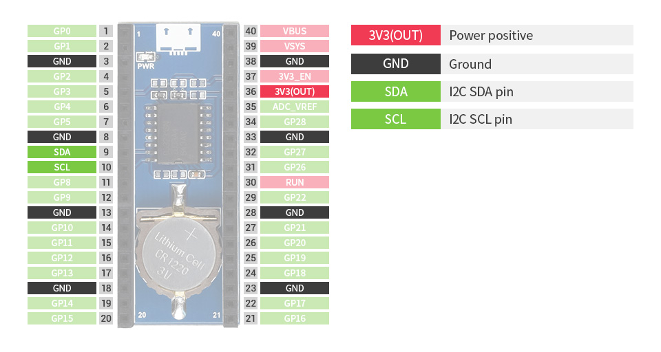 • Standard Raspberry Pi Pico header, supports Raspberry Pi Pico series