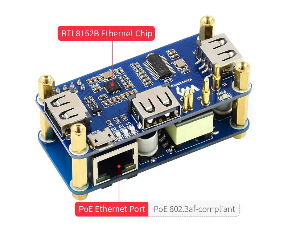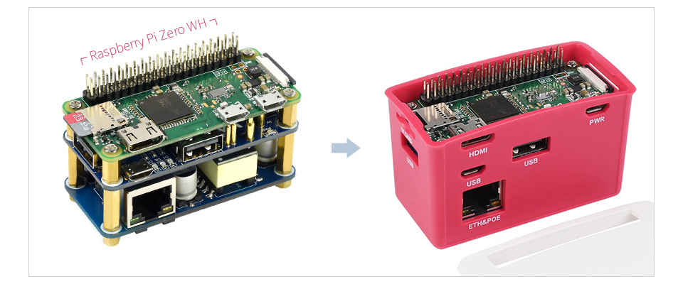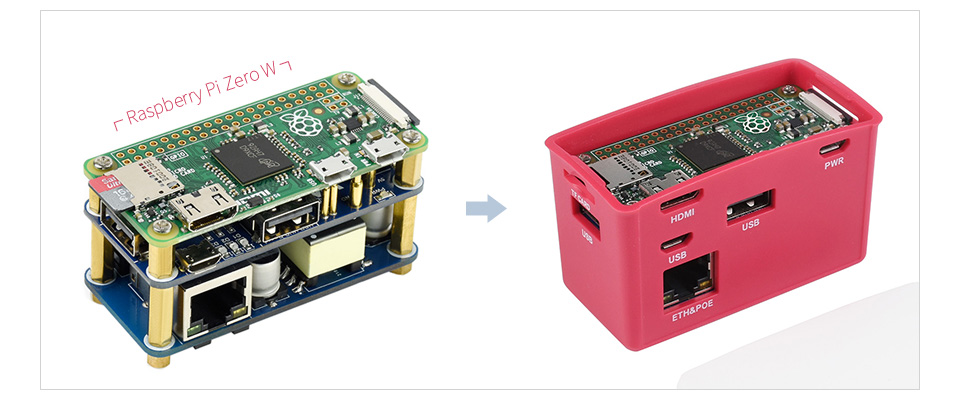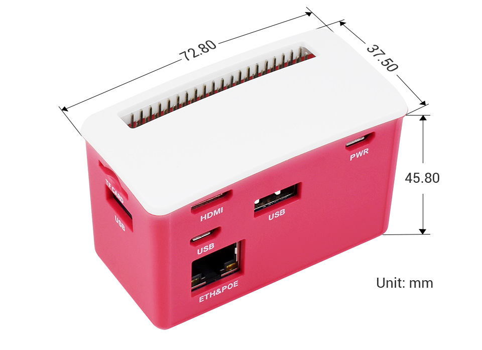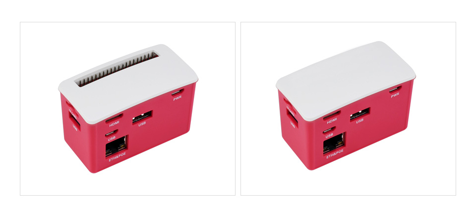 The PoE-ETH-USB-HUB-BOX is a HUB kit with PoE/ETH/USB HUB HAT inside. It is tailored for Raspberry Pi Zero series, small in size, each cut-out of the case is exactly aligned with the connector. The case adopts classic Raspberry Pi red/white color combination, with quality dull polish surface, effectively keeping the Zero away from dust. By using this small HUB BOX and some proper 802.3af-compliant power sourcing equipments, it is possible to provide both network connection and power supply for your Raspberry Pi Zero in only one Ethernet cable, along with 3x extended USB ports.