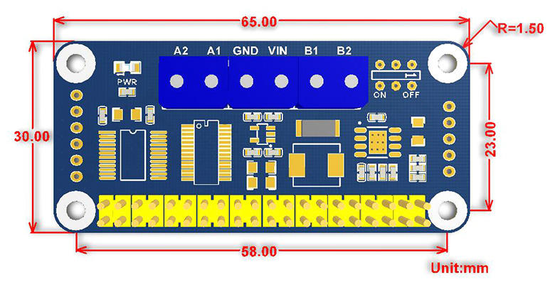 • Onboard PCA9685 chip, provides 12-bit hardware PWM to adjust motor speed