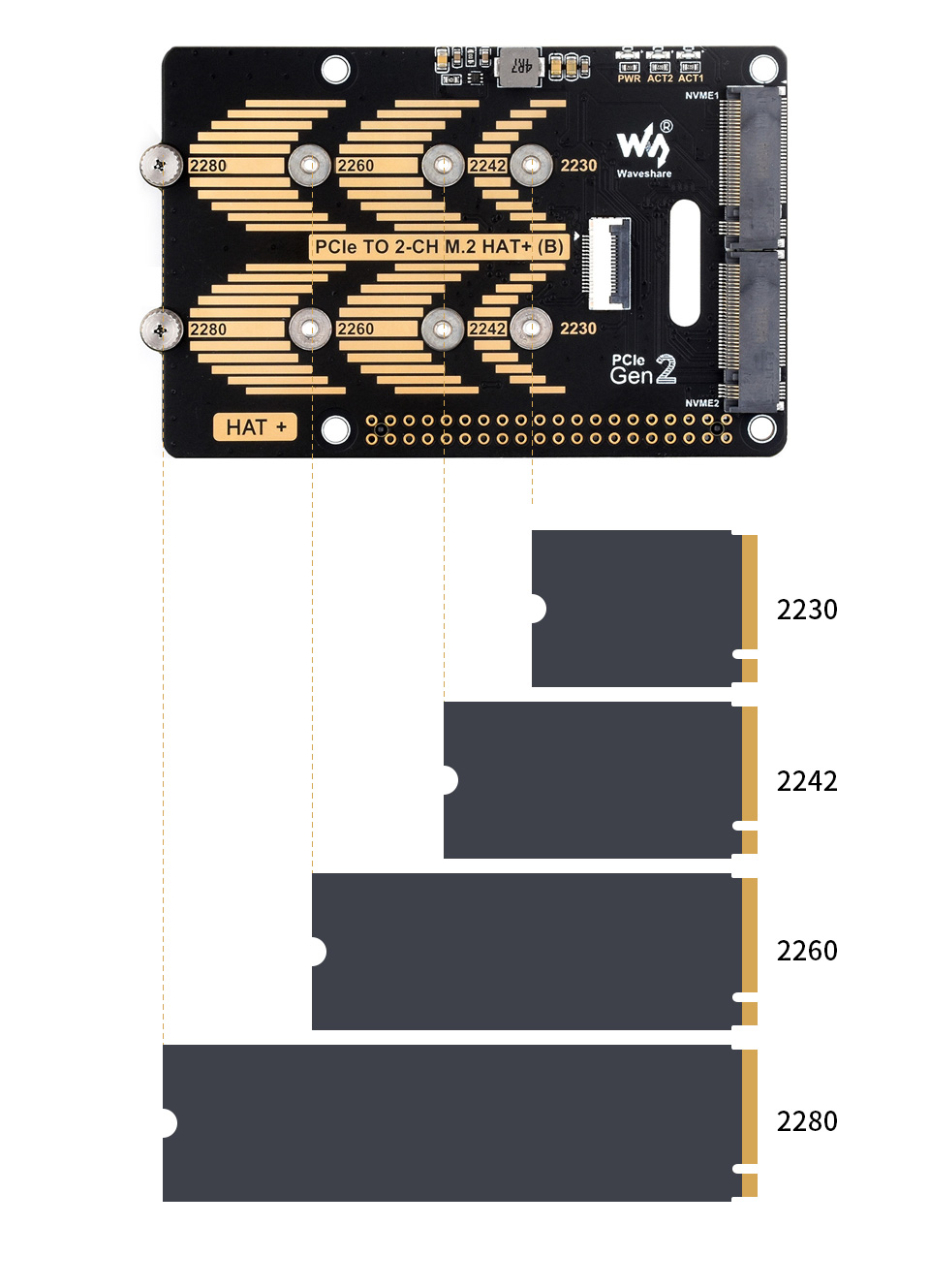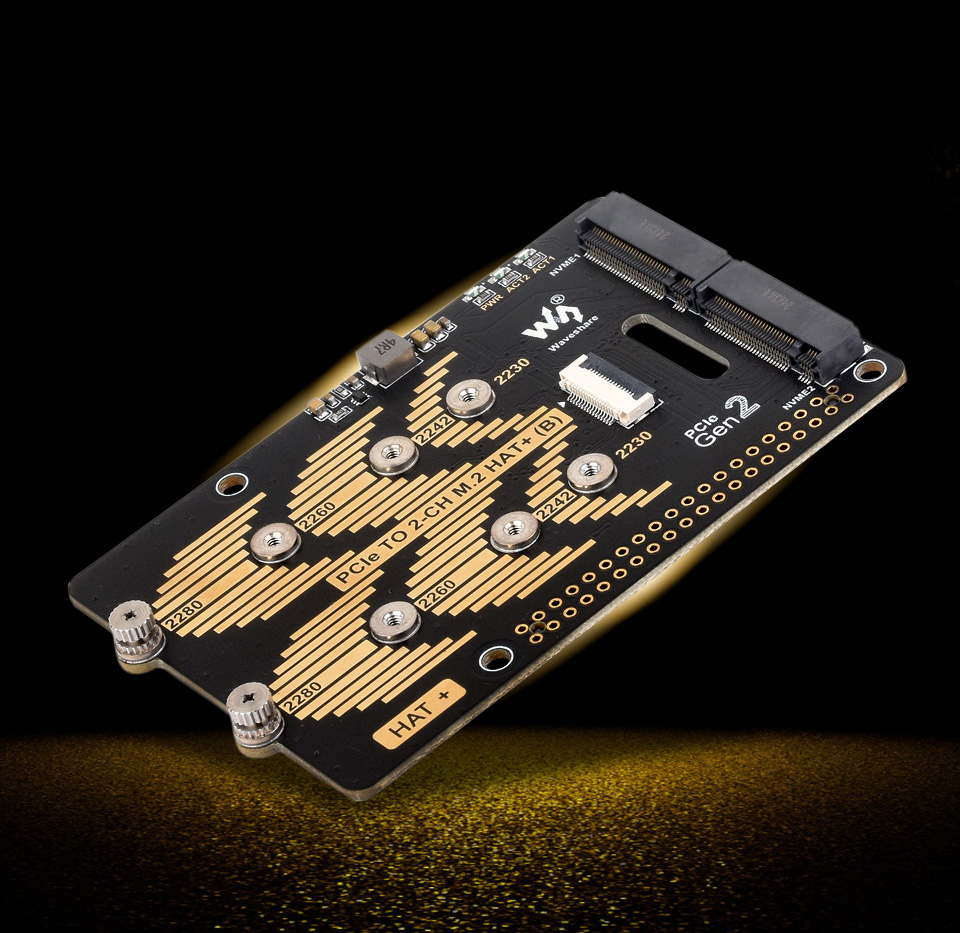 PCIe To 2-Ch M.2 Adapter Type B for Raspberry Pi 5, Compatible with 2280 / 2260 / 2242 / 2230 size NVMe Protocol M.2 SSD, Raspberry Pi 5 NVMe HAT