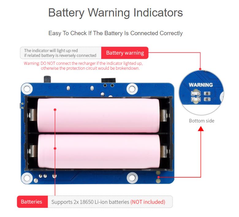 - Batteries warning indicators, easy to check if the battery is connected correctly