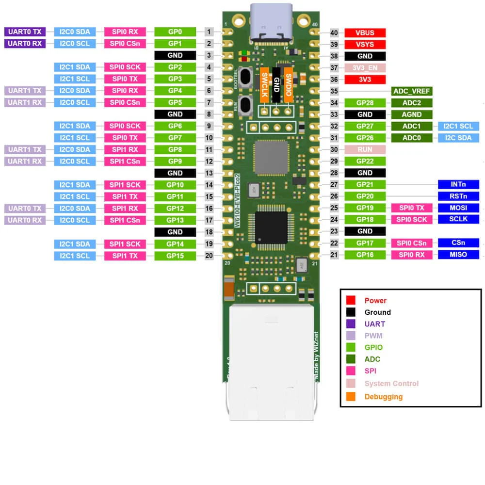 The W6100-EVB-Pico2 pinout is directly connected to the GPIO of RP2350 as shown in the pinout image. It has the same pinout as the Raspberry Pi Pico 2 board. However, GPIO16, GPIO17, GPIO18, GPIO19, GPIO20, GPIO21 are connected to W6100 inside the board. These pins enable SPI communication with W6100 to use the Ethernet function. If you use the Ethernet function, these pins cannot be used for any other purpose.